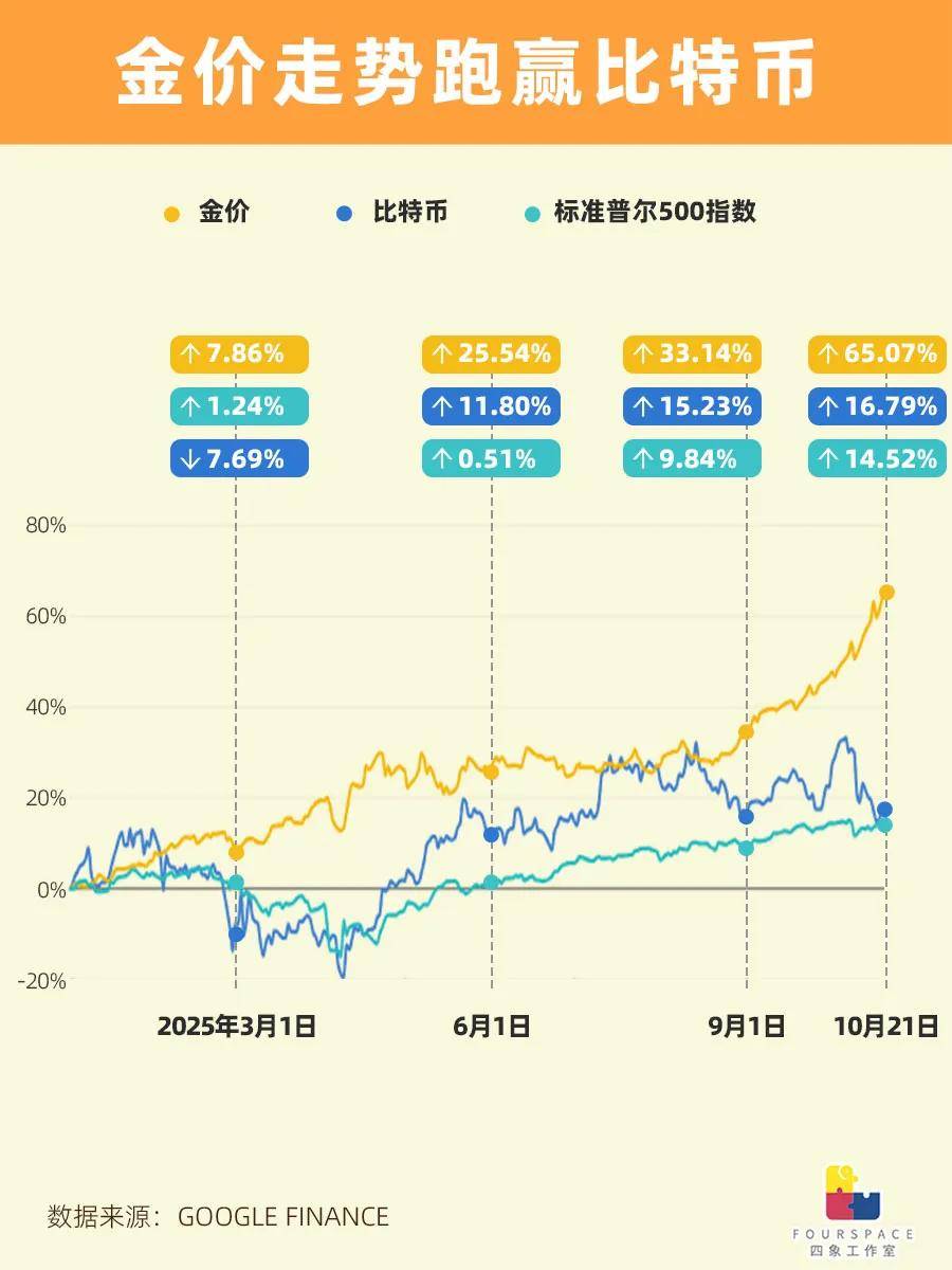截至今年10月,国际金价再创历史新高,现货黄金盘中突破4000美元/盎司,年内涨幅突破50%。与过去几年被比特币抢尽风头不同,今年黄金领涨全球资产的态势已经不可逆转。