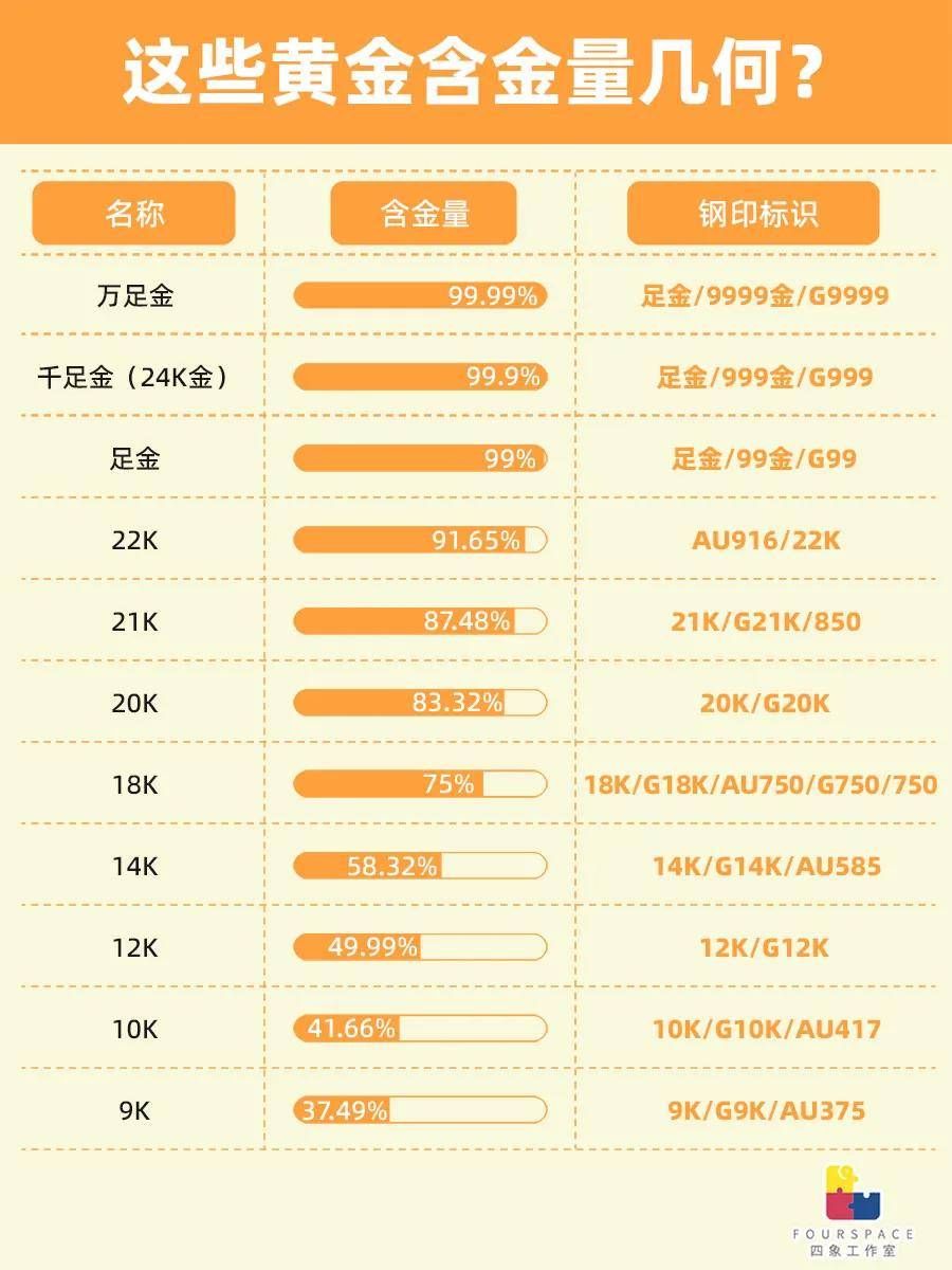 而所谓的K金,其实是一种含黄金的合金。通过添加银、铜、锌等金属,增加硬度的同时,精准控制产品的含金量。国际上以“K”为单位,1K≈4.166%含金量,例如9K金含金量37.5%,14K金含金量58.5%,18K金的含金量75%,24K则被看作理论上的纯金(实际含金量99.9%)。