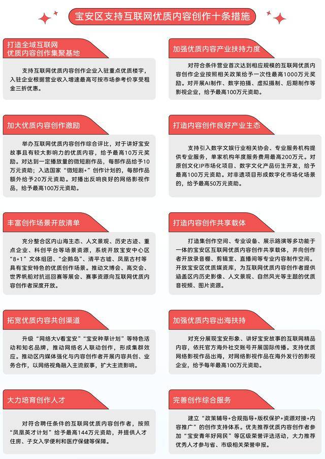 为加大优质内容创作激励,宝安将举办互联网优质内容创作综合评比,对于讲好宝安故事且有较大影响力的优质内容,给予最高10万元奖励。对达到一定播放量的微短剧,每部给予10万元资助;入选国家“微短剧+”创作计划的,每部作品额外给予20万元资助。对播出反响良好的网络影视作品,给予最高100万元资助。