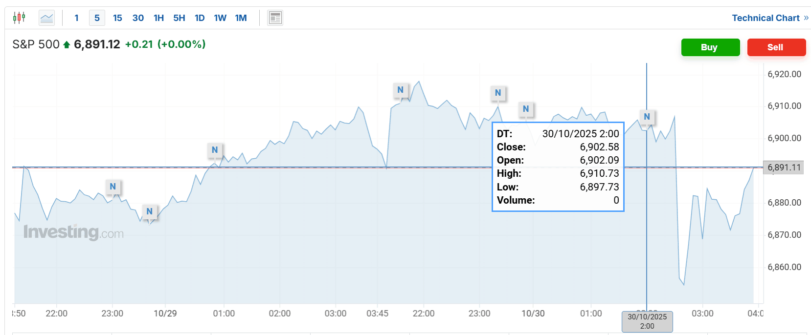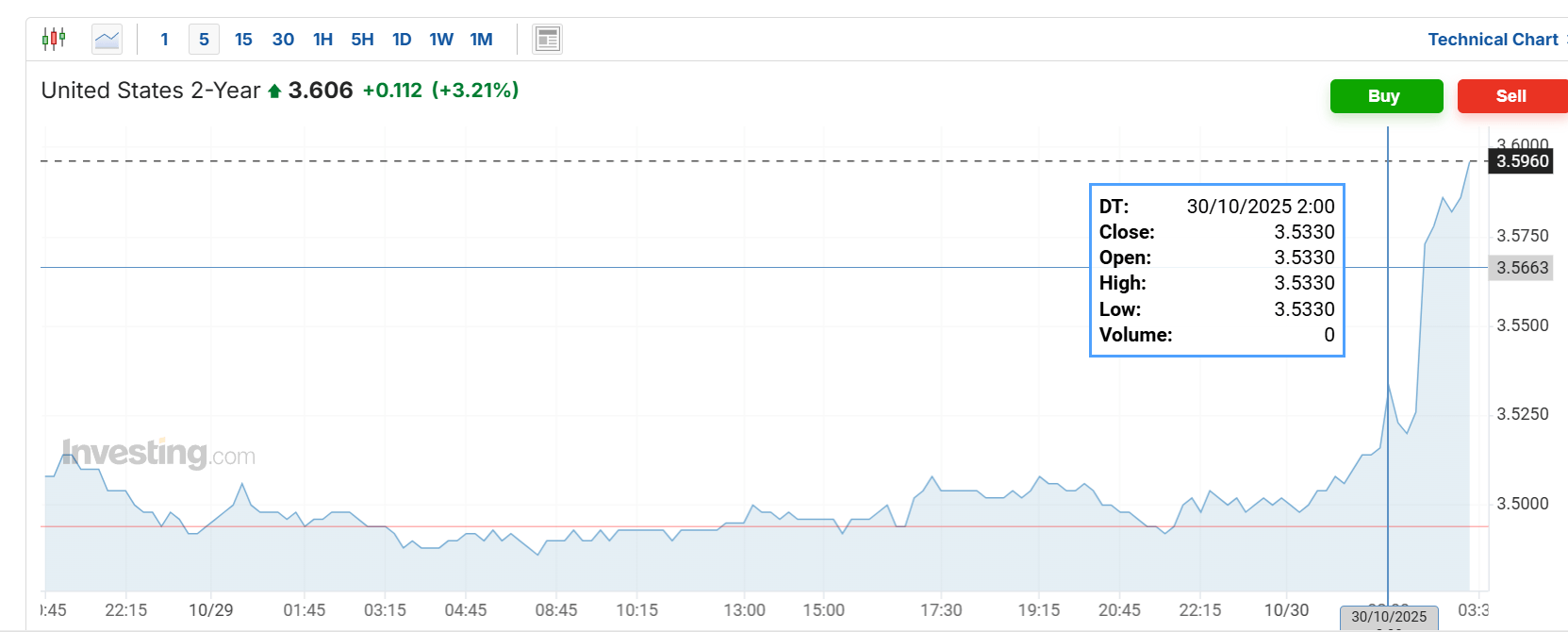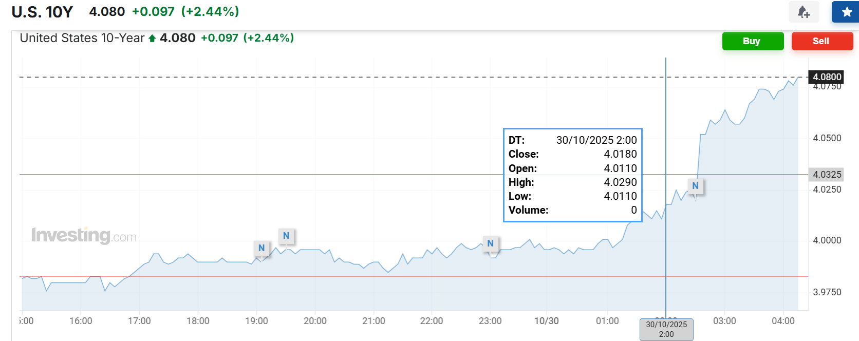 美联储发布10月决议声明前数分钟,美股、黄金日内上涨,美债、比特币日内下跌: