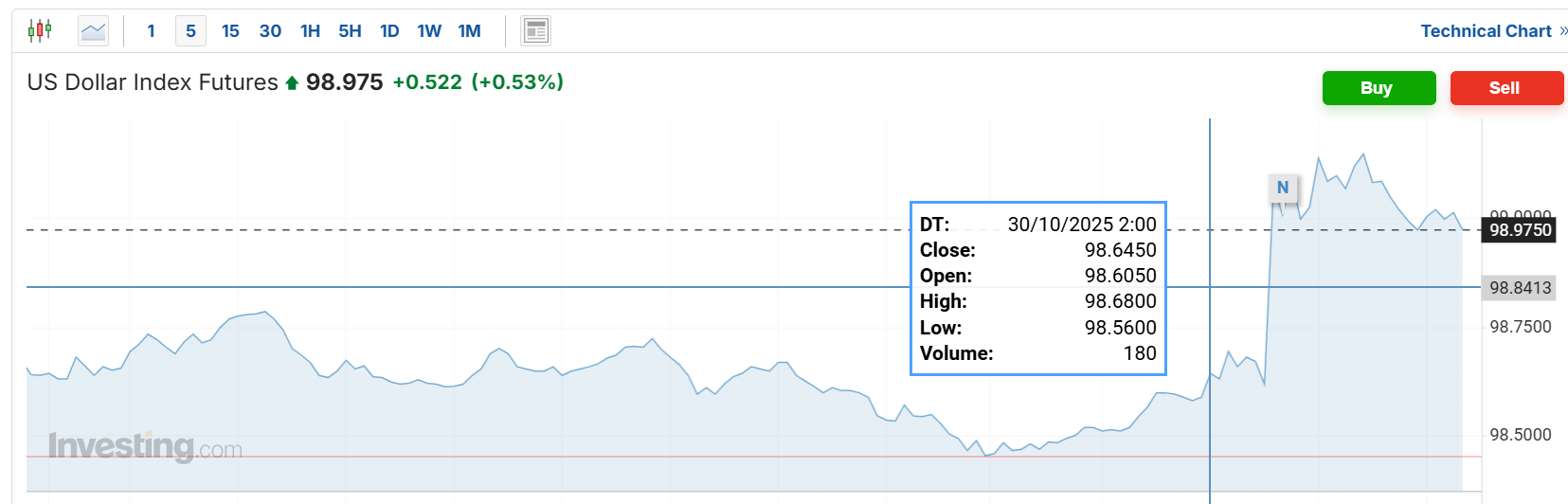 - 北京时间周四02:30鲍威尔谈及12月降息前景后,美元瞬间拉升,日内稍早持续交投于99点下方。