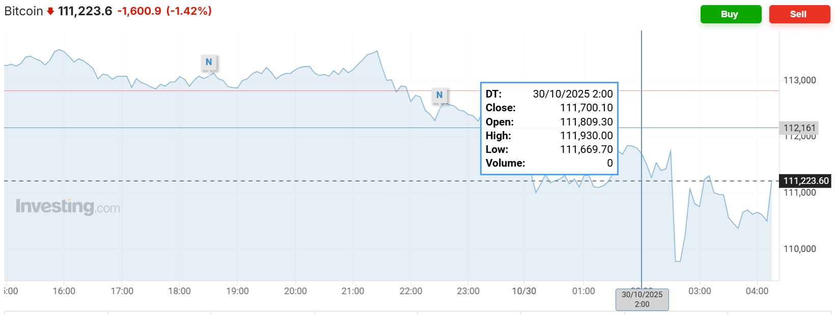 - 比特币短线从11.2万美元附近跳水,至接近10.9万美元的水平。以太坊跌幅更大。