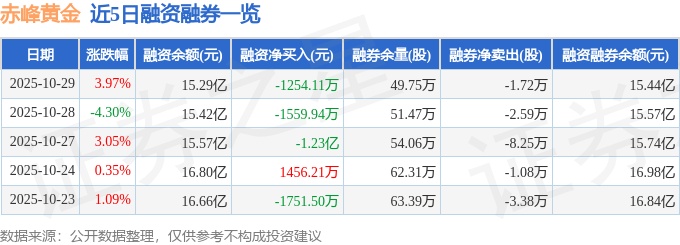赤峰黄金融资融券信息显示,融资方面,当日融资买入1.23亿元,融资偿还1.35亿元,融资净偿还1254.11万元。融券方面,融券卖出2.93万股,融券偿还4.65万股,融券余量49.75万股,融券余额1473.1万元。融资融券余额15.44亿元。