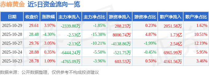 证券之星消息,截至2025年10月29日收盘,赤峰黄金(600988)报收于29.61元,上涨3.97%,换手率2.61%,成交量43.35万手,成交额12.65亿元。