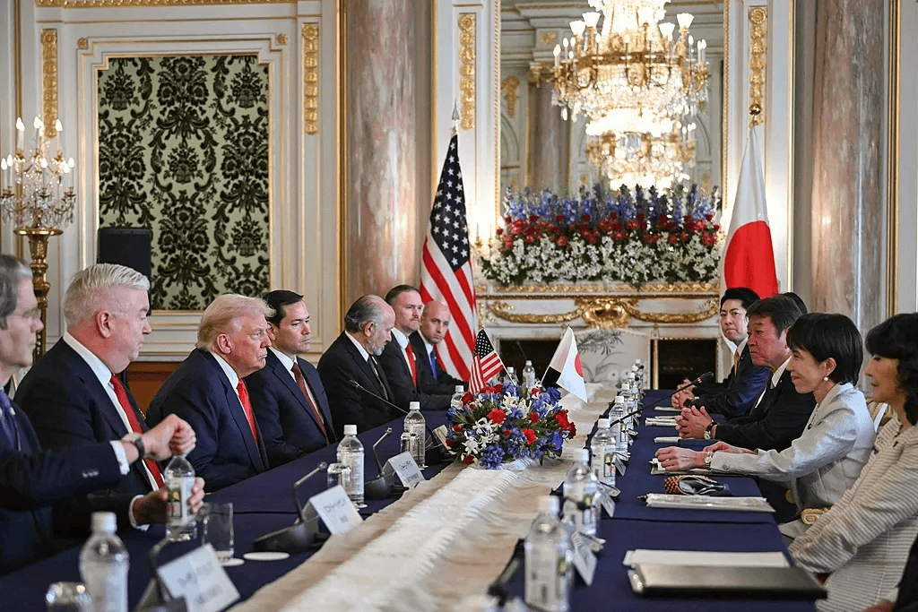 当地时间10月28日,日本首相高市早苗(右二)和美国总统特朗普(左三)在东京赤坂迎宾馆举行会谈。图源:视觉中国