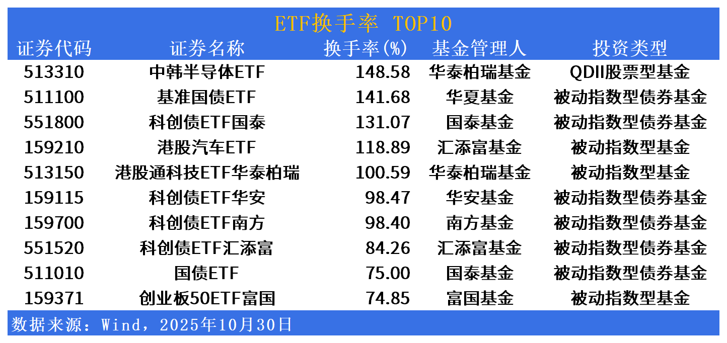 换手率方面,中韩半导体ETF(513310)换手率居首,达148%;基准国债ETF(511100)、科创债ETF国泰(551800)、港股汽车ETF(159210)换手率居前。