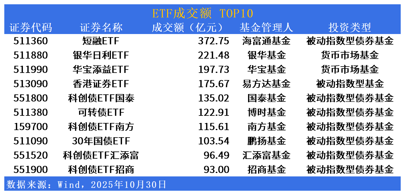 成交额方面,短融ETF(511360)今日成交额居首,达372亿元;银华日利ETF(511880)、华宝添益ETF(511990)、香港证券ETF(513090)成交额紧随其后。