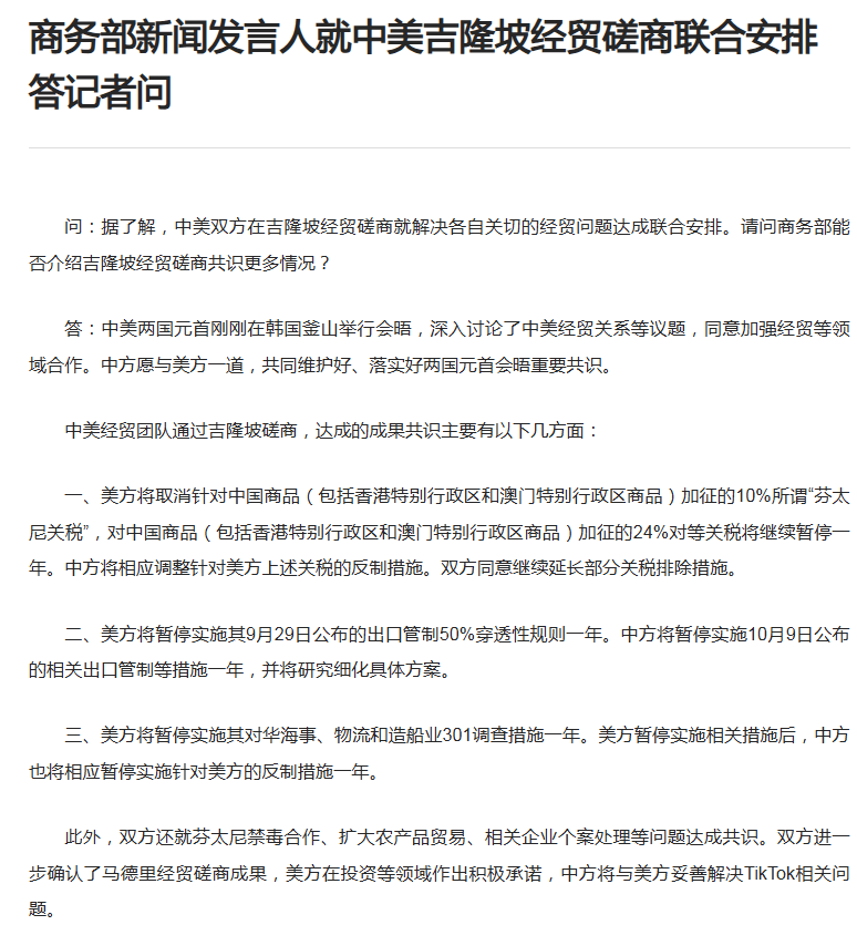 根据中国商务部发言人所述,美方取消10%的“芬太尼关税”、暂停24%的对等关税一年。