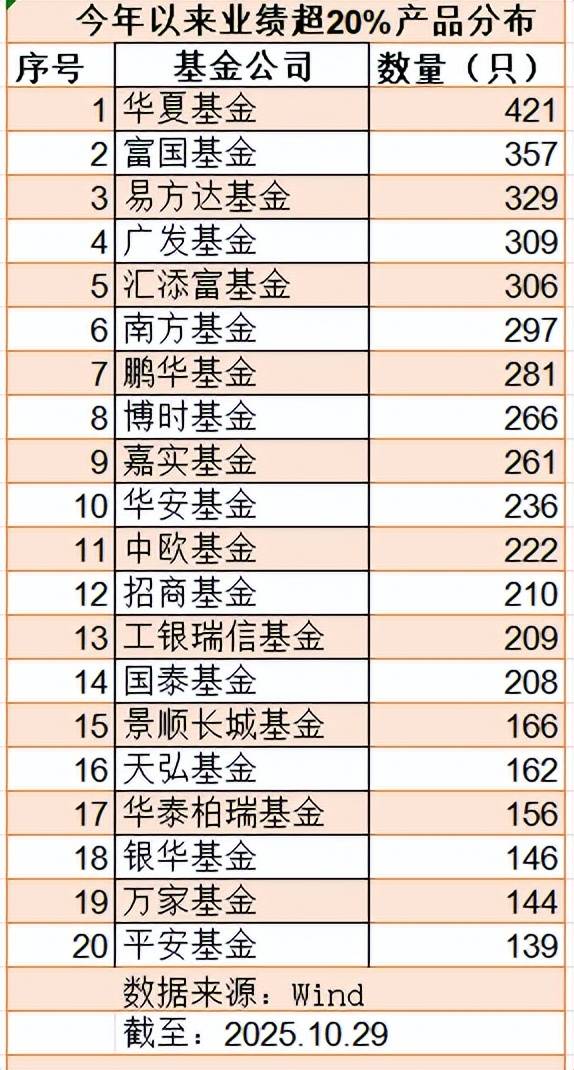 当然,由于每只产品规模有大小,业绩超20%的产品数量多,不一定意味着某家基金公司今年总收益就大。但是,无论如何,这类绩优产品数量越多,整体收益应该越高。
