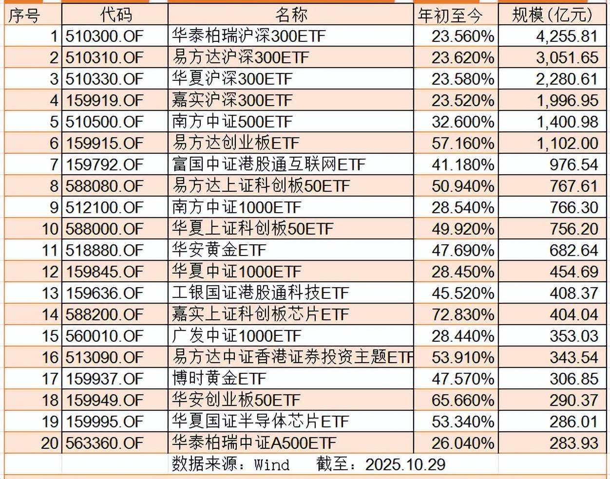 其中,规模上千亿的总共6只,分别是:华泰柏瑞沪深300ETF,4255.81亿元;易方达沪深300ETF,3051.65亿元;华夏沪深300ETF,2280.61亿元;嘉实沪深300ETF,1996.95亿元;南方中证500ETF,1400.98亿元;易方达创业板ETF,1102.00亿元。