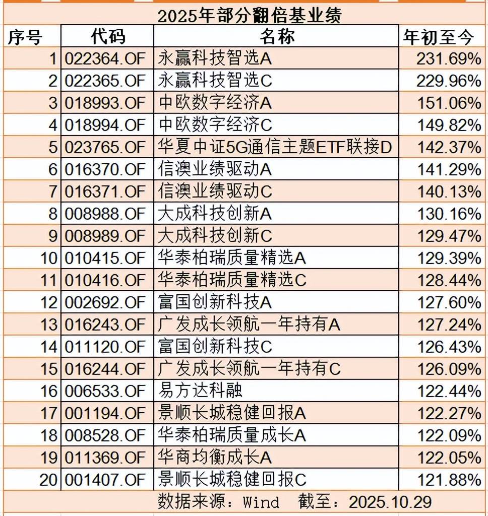 上述翻倍基TOP20榜单中,业绩靠前的分别是:永赢科技智选A/C ,中欧数字经济A/C ,华夏中证5G通信主题ETF联接D,信澳业绩驱动A/C,大成科技创新A/C。