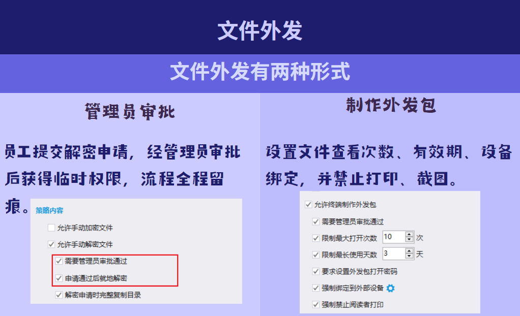 文件外发包:需要外发给合作伙伴时,可制作一个“加密包裹”,限制对方查看次数、时间、使用设备,并禁止打印。