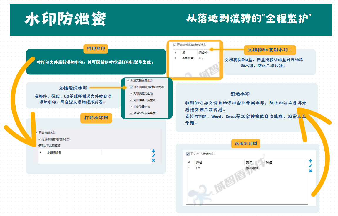 文档水印:支持屏幕水印、打印水印、文档水印等,甚至包括难以察觉的隐形点阵水印,一旦拍照泄密,可迅速追溯源头。