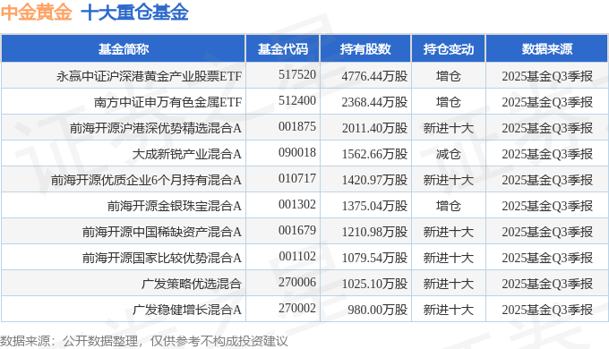 持有中金黄金最多的基金为永赢中证沪深港黄金产业股票ETF,目前规模为116.69亿元,最新净值1.9592(10月30日),较上一交易日上涨0.17%,近一年上涨60.14%。该基金现任基金经理为刘庭宇。