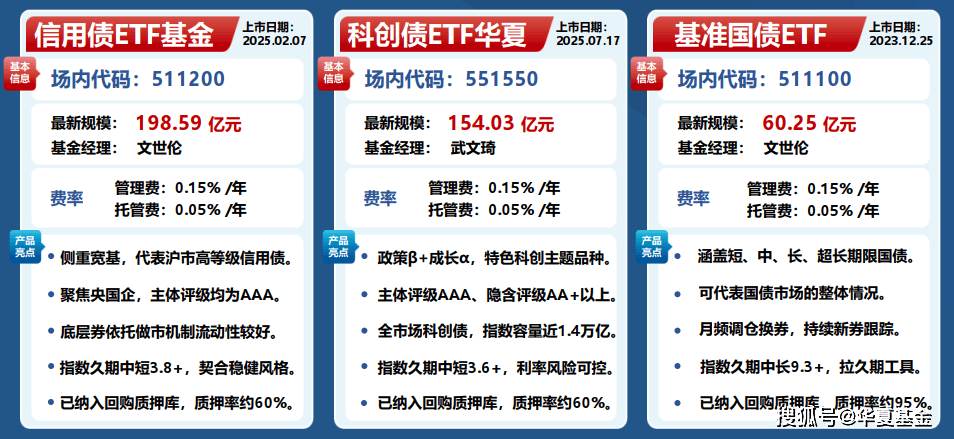 目前华夏基金旗下有三只债券ETF,分别是科创债ETF、信用债ETF和基准国债ETF。