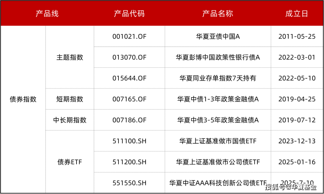 在债券指数投资上布局较早,当前华夏基金旗下共有8只指数债基产品,涵盖短期指数、中长期指数、主题指数、债券ETF各类,成为投资者分享债市机遇的重要工具。