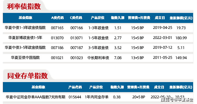 当然,有短就有长,与短期指数相对应的是 中长期指数,比如华夏中债3-5年政策金融债,聚焦3-5年政金债,与刚才说的中债-1-3年政策性金融债全价(总值)指数一样,也具备类国债、高流动性等特点。