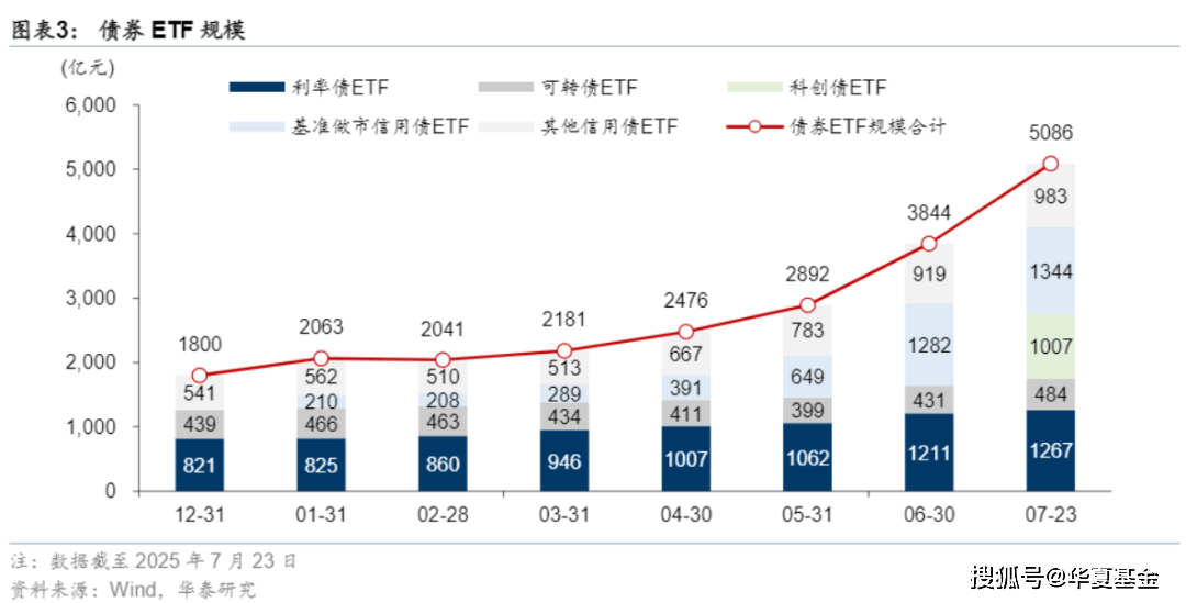 但债券ETF支持T+0交易,投资者既可以在一级市场以组合证券来申购、赎回债券ETF份额,也可以在二级市场买卖债券ETF份额。大大提高了交易便捷性,自去年以来规模实现了大爆发。截止2025年7月23日,债券ETF总规模已突破5000亿元。其中,10只科创债ETF上市后(7月17日上市)仅5个交易日便突破 1000亿元。