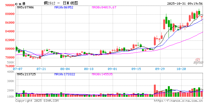 美联储10月如期降息25个基点,联邦基金利率下调至3.75%-4.00%,是年内第二次降息,并将于12月1日起结束缩表,鲍威尔称12月是否降息远未成定局,为市场降温;美元指数和美债收益率走升,贵金属冲高回落,对铜价有一定拖累。10月30日,中、美元首在韩会晤,达成系列共识,取得积极进展,有利于稳定市场情绪。短期宏观面没有太多利空,但由于铜价达到历史性高位,畏高情绪加重,资金可能获利了结。另外,铜价与贵金属有联动性,近期贵金属出现调整,对于铜价的压力也将体现,而若贵金属重拾涨势,铜价也难有明显调整。
