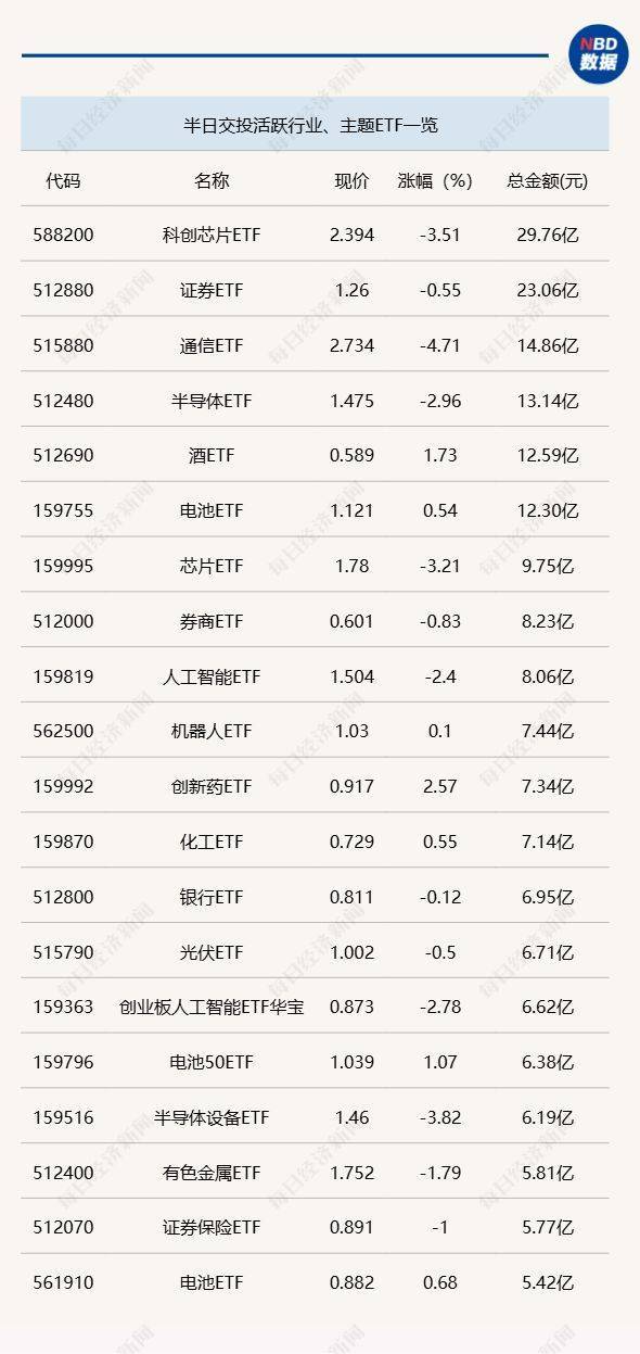 10月31日上午,芯片概念股出现大幅回调,多只芯片相关ETF交投活跃,科创芯片ETF(588200)、半导体ETF(512480)半日成交金额均超过10亿元,而白酒股出现反弹,酒ETF(512690)半日成交金额放大至12.59亿元。跨境ETF方面,随着创新药板块大涨,港股创新药ETF(513120)交易活跃度提升,半日成交金额高达88.34亿元。