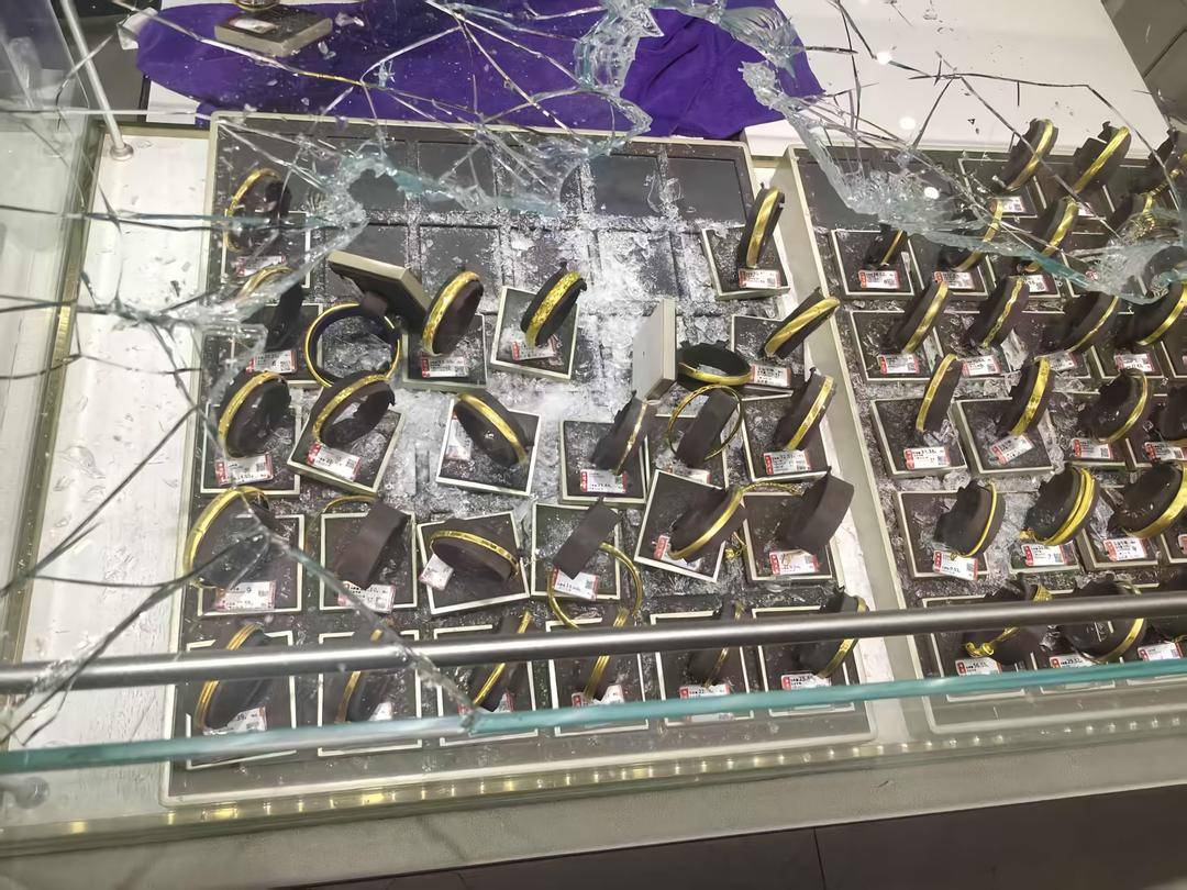 工作人员介绍,为方便展示,存放黄金的柜台是玻璃展柜,使用的是比较厚的钢化玻璃,犯罪嫌疑人拿着大铁锤,几下就把展柜砸坏了,“大概600多克黄金,人民币现在黄金的价格60多万吧”。