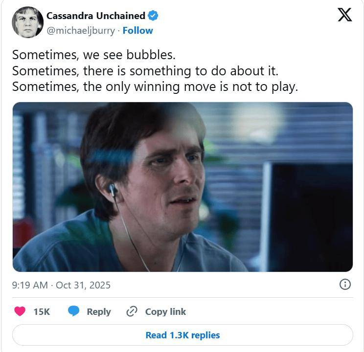 迈克尔・伯里携电影《大空头》配图预警市场泡沫,声称“有时不参与才是赢家”,虽未明指泡沫是什么,但这一发声时机恰逢AI热潮引质疑。