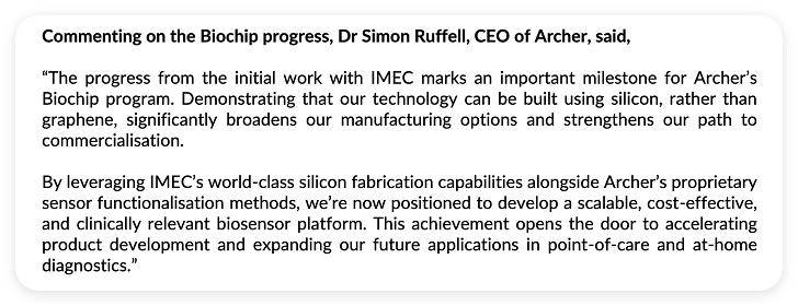 Archer CEO Simon Ruffell博士表示,“与IMEC的初步合作表明,我们的技术可以使用硅而不是石墨烯来构建”,这将降低生物芯片的供应链风险和单位成本,有望加速制造和商业化进程。