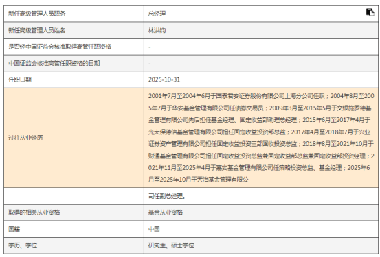 10月31日,天治基金发布公告称,公司原副总经理林洪钧升任为总经理。