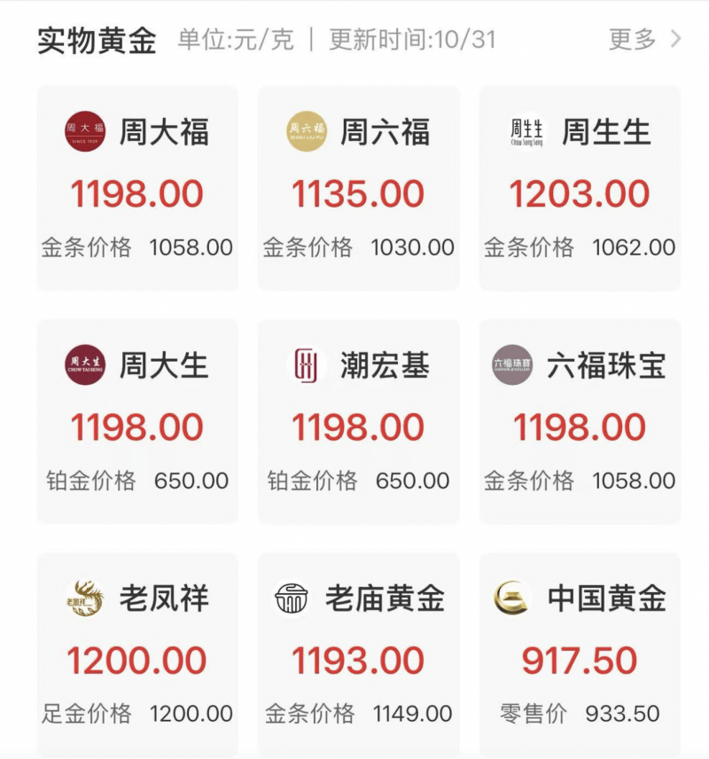 与此同时,多家国内品牌金店足金饰品的挂牌价格也已从高点的1294元/克降至1200元/克以下,金条价格也一路走跌。