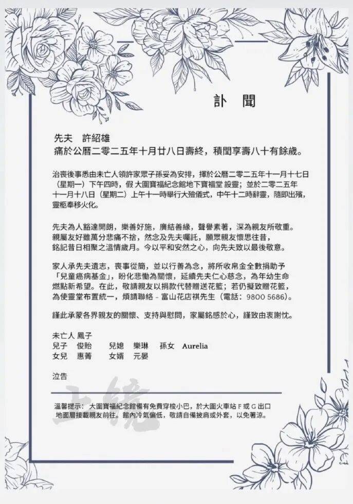 家人承先夫遗志,丧事从简,并以行善为念,将所收帛金全数捐助予「儿童癌病基金」,盼化悲恸为关怀,延续先夫仁心慈念,为年幼生命燃点新希望。谨此承蒙各界亲友的关怀、支持与慰问,家属铭感于心,谨致由衷谢忱。