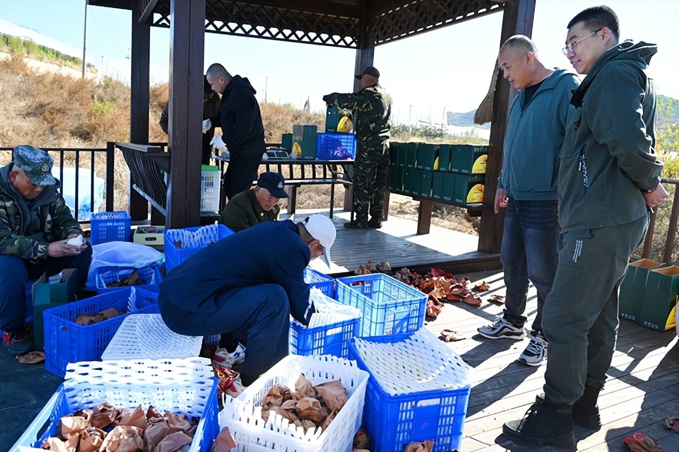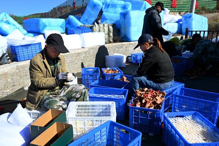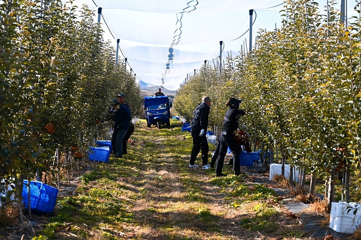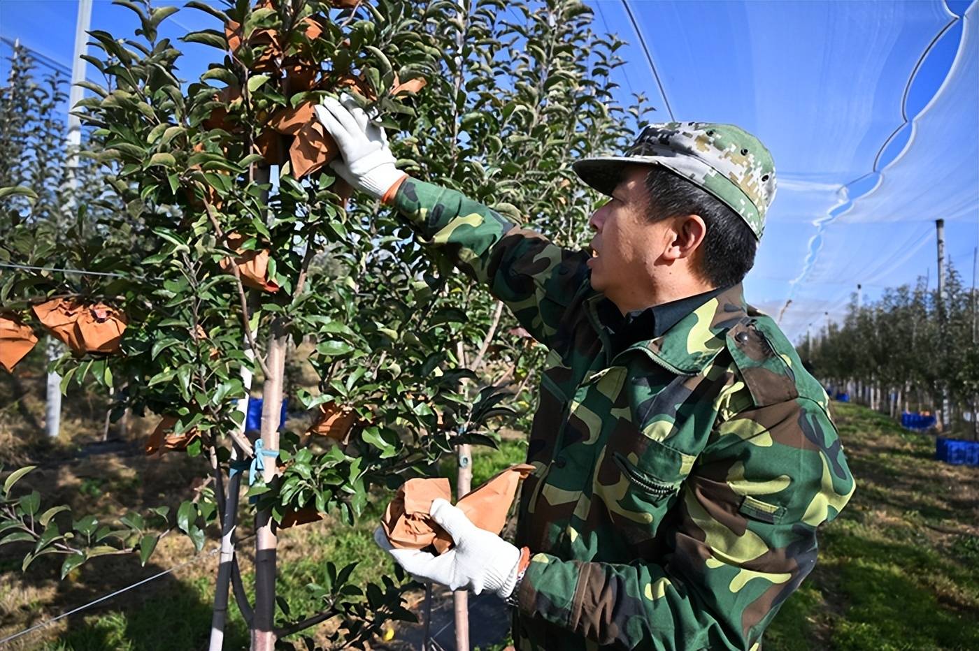 记者注意到,在苹果种植地的一旁,部分工人们同步开启分拣工作,将苹果按大小、色泽分级,逐个套上防撞网套,再整齐装入礼盒中,整个流程井然有序,只为让“黄金果”以最佳品相抵达消费者手中。