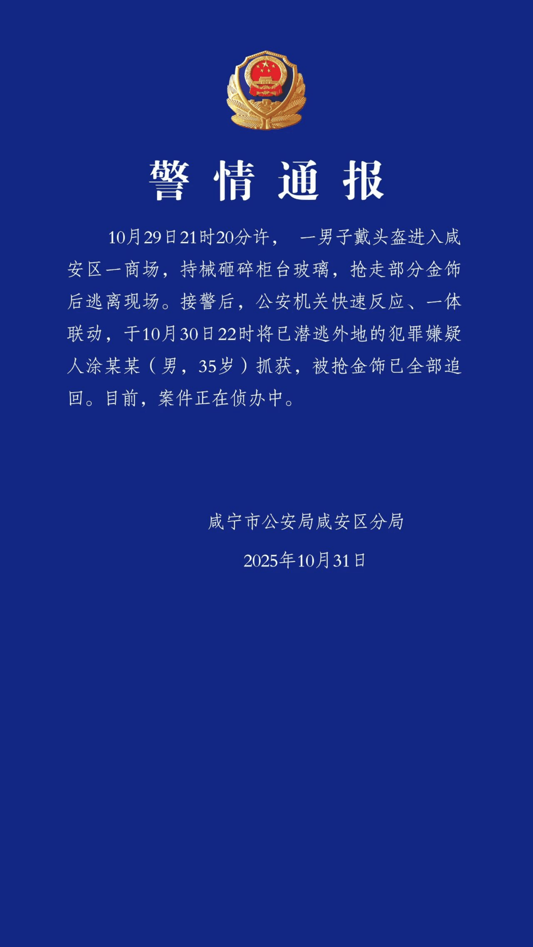 据通报,10月29日21时20分许,一男子戴头盔进入咸安区一商场,持械砸碎柜台玻璃,抢走部分金饰后逃离现场。接警后,公安机关快速反应、一体联动,于10月30日22时将已潜逃外地的犯罪嫌疑人涂某某(男,35岁)抓获,被抢金饰已全部追回。目前,案件正在侦办中。
