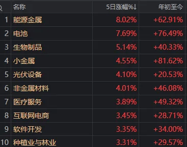 同花顺数据显示,行业指数中,本周新能源赛道下的能源金属、电池、光伏设备,以及医药方向的部分题材表现强势。此外AI应用端(软件开发)、种植业等方向也局部活跃。