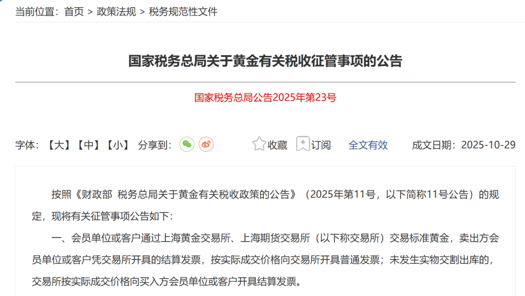按照《财政部 税务总局关于黄金有关税收政策的公告》(财政部 税务总局公告2025年第11号,以下简称11号公告),税务总局配套制发了《国家税务总局关于黄金有关税收征管事项的公告》(国家税务总局公告2025年第23号),就黄金有关税收征管事项进一步予以明确。