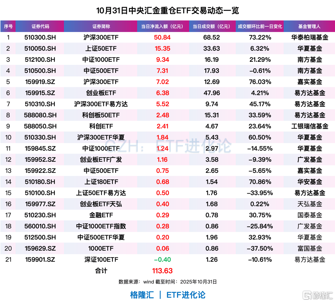 而中央汇金投资重仓的21只ETF,周五合计净流入额高达113亿元,直接撑起股票ETF市场当日净流入额的半壁江山。
