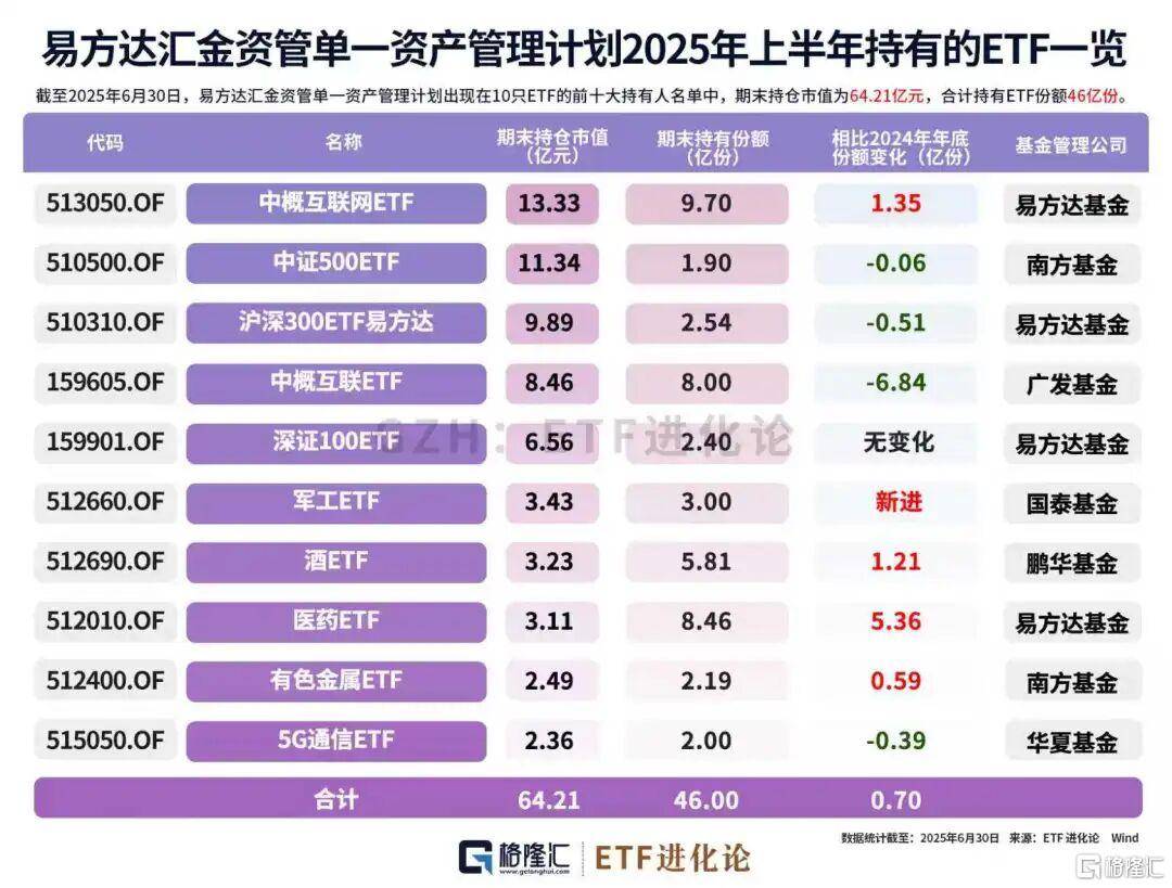 如华夏汇金资管单一资产管理计划在7月直接清仓恒生红利ETF,将Q2持有的8059万份份额尽数出售,同时7月还减持80万份的汽车ETF。