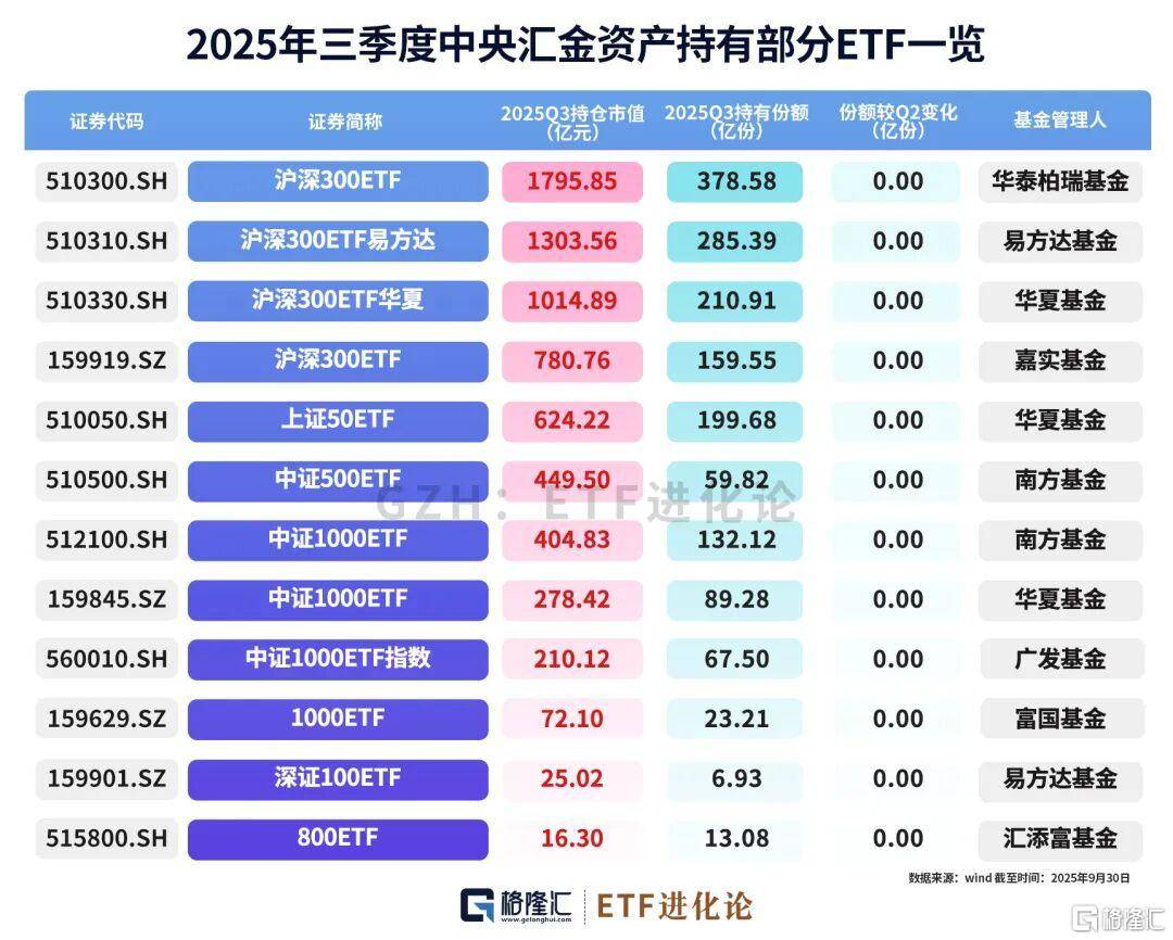 其中,中央汇金投资有限责任公司三季度持仓比例超20%的ETF产品有15只,合计持仓市值为7777.97亿元,且持仓份额相比Q2保持不变。