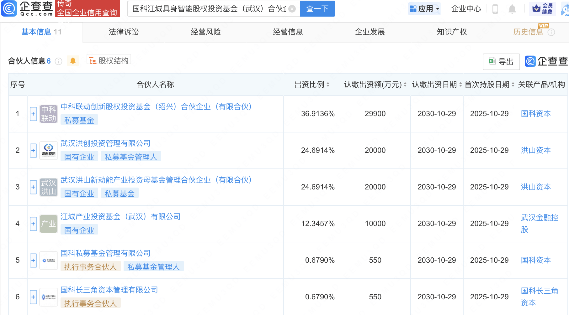 企查查APP显示,近日,国科江城具身智能股权投资基金(武汉)合伙企业(有限合伙)成立,出资额8.1亿元,经营范围包含:私募股权投资基金管理、创业投资基金管理服务等。企查查股权穿透显示,该企业由中科联动创新股权投资基金(绍兴)合伙企业(有限合伙)、国科长三角资本管理有限公司等共同出资。