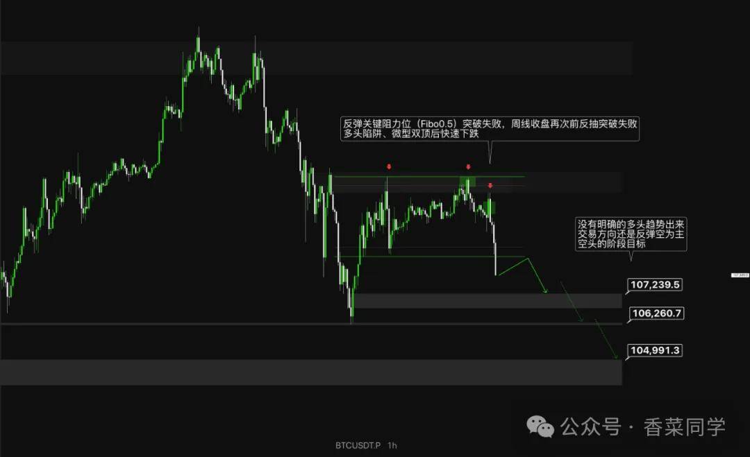 BTC1H 反弹关键阻力位(Fibo0.5)突破失败,周线收盘再次前反抽突破失败 多头陷阱、微型双顶后快速下跌 没有明确的多头趋势出来交易方向还是反弹空为主,空头的阶段目标看10.5!