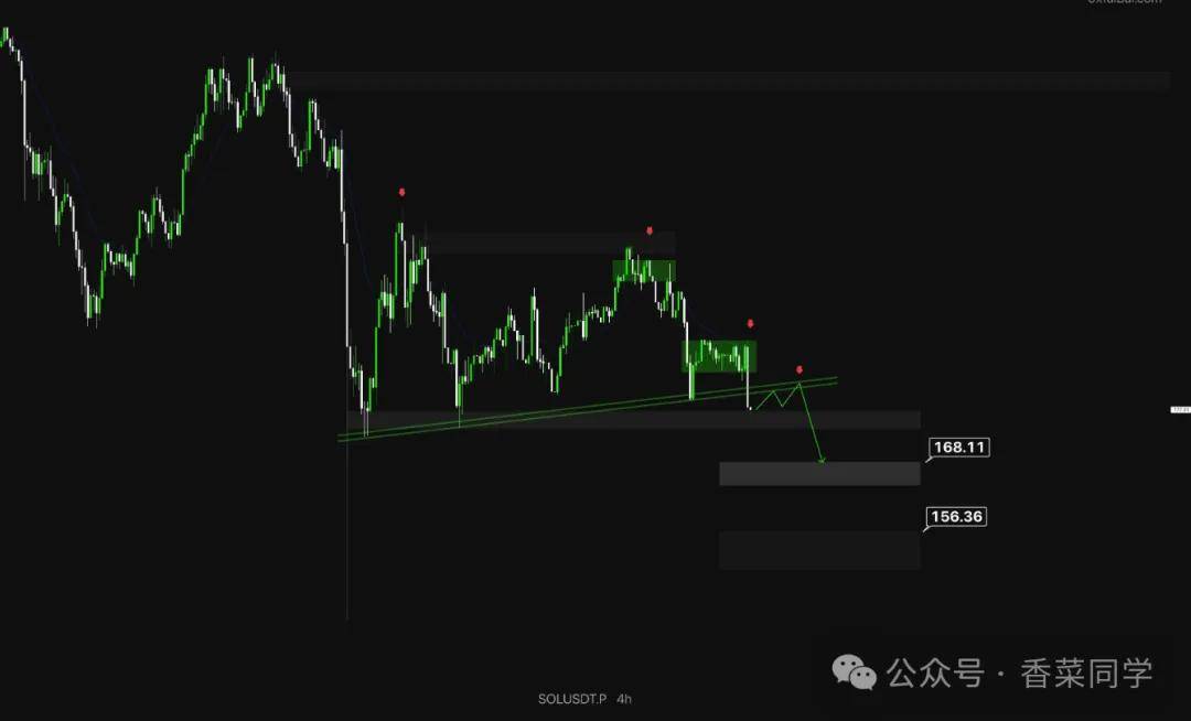 SOL下跌趋势,大型震荡区间底部支撑区间 反复测试的支撑高点越压越低跌破概率加大 跌破趋势线支撑,可以等反抽做空。