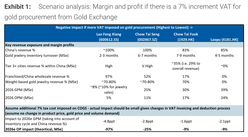 摩根士丹利的情景分析显示,在额外征收7%税收成本的假设下,不同珠宝商面临的冲击程度存在显著差异。