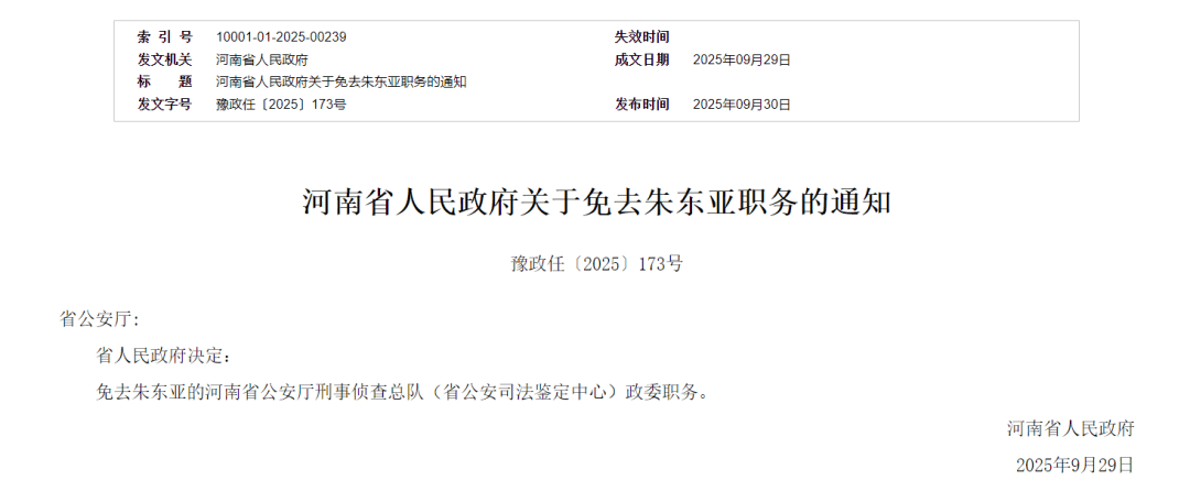 9月29日,河南省人民政府发布通知,免去朱东亚的河南省公安厅刑事侦查总队(省公安司法鉴定中心)政委职务。