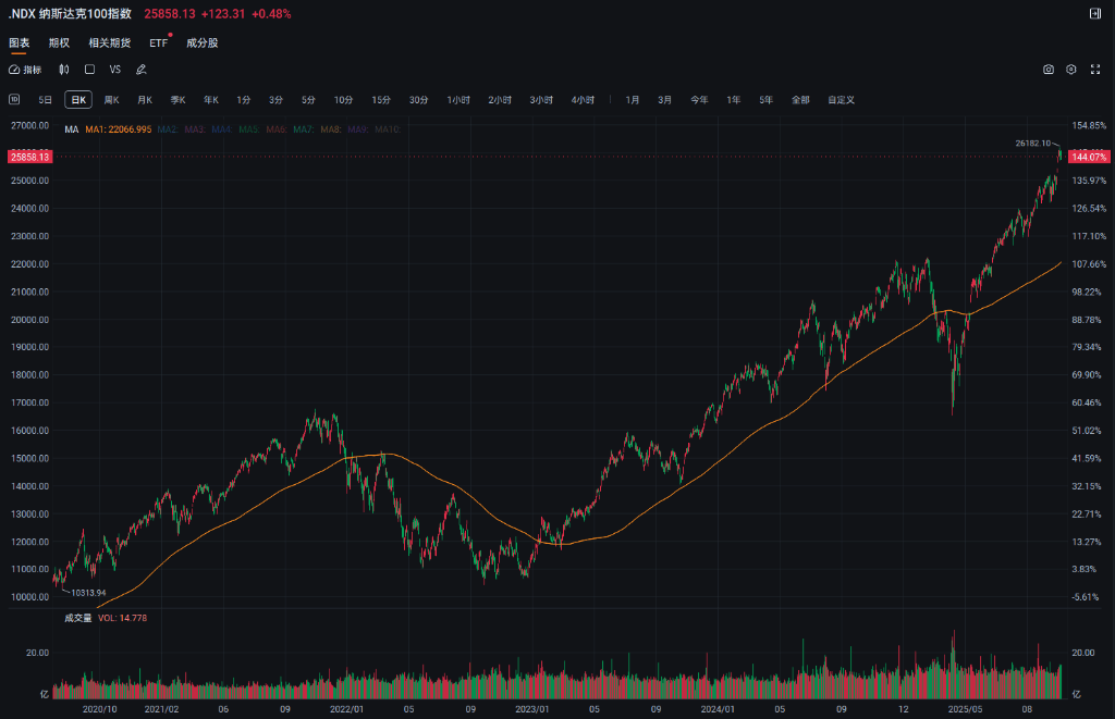 (图为纳斯达克指数日K线走势图,橙色为200日移动均线)