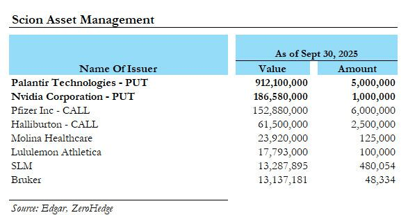提前两周公布的13F文件证实,Burry确实在"采取行动"。他针对Palantir的看跌期权名义价值高达9.12亿美元(相当于500万股),针对英伟达的看跌期权名义价值达1.86亿美元。不过,文件未披露期权的实际支付权利金、行权价及到期日。