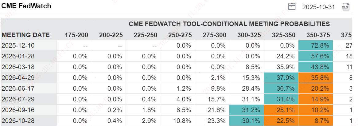 现阶段黄金ETF处于多空因素交织的格局,短期压力与核心支撑形成鲜明对比。压力端来看,市场对国际经贸关系缓和的预期升温,削弱了黄金避险功能,前期避险资金逐步撤离转向风险资产,导致伦敦金现自10月中旬高位下跌超10%,10月28日盘中跌至3886.2美元/盎司低点,黄金ETF随之面临短期赎回与持仓调整压力。支撑端而言,美联储10月29日已如期降息25个基点,将联邦基金利率目标区间下调至3.75%-4.00%,这是2024年9月以来的第五次降息,直接降低了黄金持有成本,也对美元形成潜在削弱作用,为黄金价格及黄金ETF提供基础支撑。不过,美联储主席鲍威尔表态称市场“过度押注”12月降息为时尚早,后续政策路径取决于数据,这给市场带来了不确定性。目前截至10月底,12月降息概率降低到72.8%。