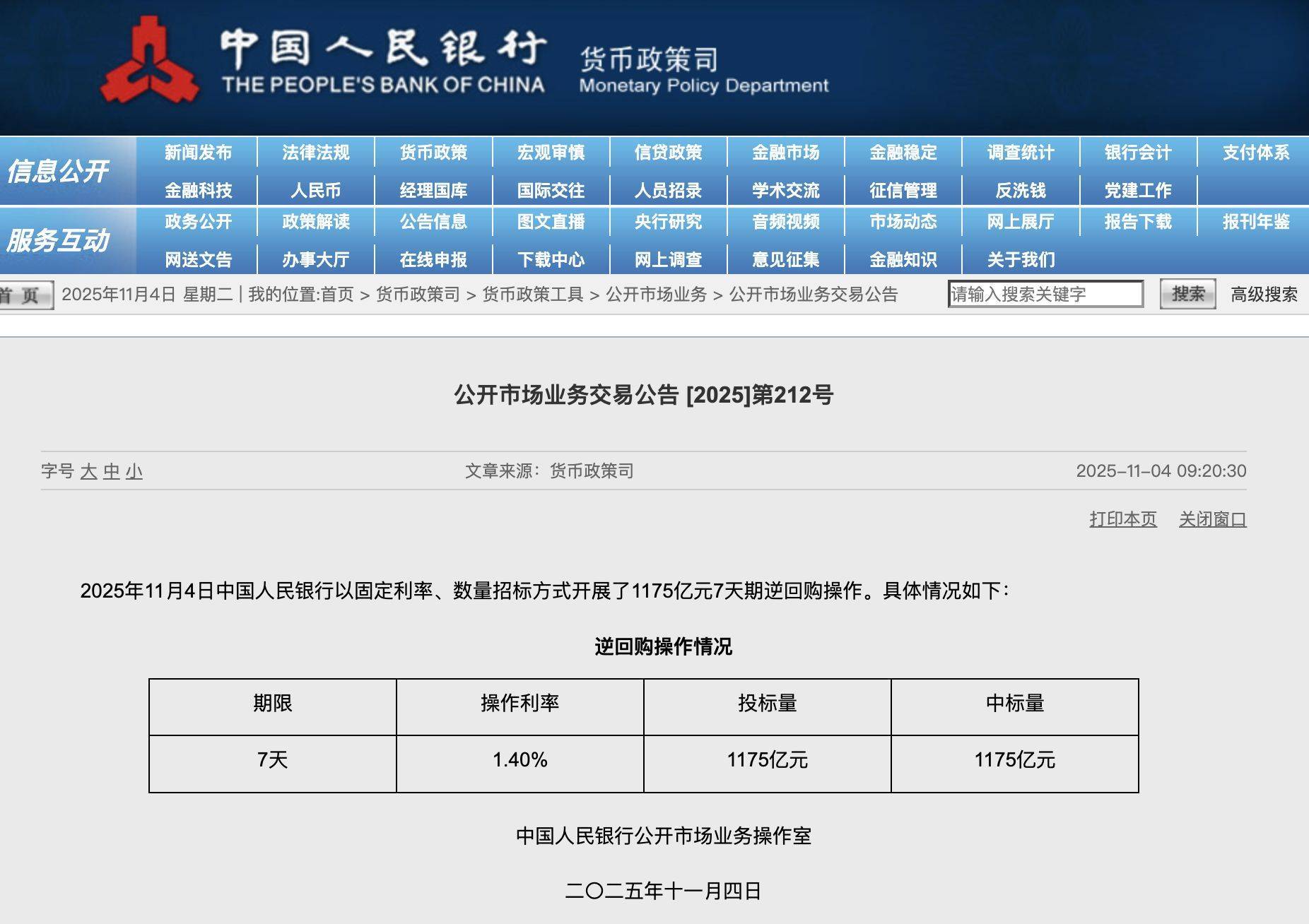 11月4日,央行公告,为保持银行体系流动性充裕,2025年11月5日,中国人民银行将以固定数量、利率招标、多重价位中标方式开展7000亿元买断式逆回购操作,期限为3个月(91天)。