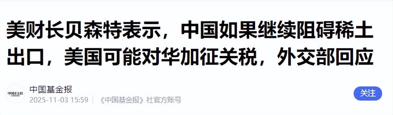 根据10月31日,美国彭博社报道,美贸易代表表示,中美关系中依然存在很多没有解决的问题,所以要重启对华301调查,美财长贝森特甚至威胁中国,不卖稀土就加税。