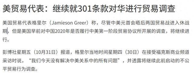 10月份美国方面再次对中国进行301调查,表面文章做得冠冕堂皇,公开给出的理由是要审查中国对2020年那份第一阶段协议的履行情况,但明眼人都看得出来,这不过是场面上的说辞。