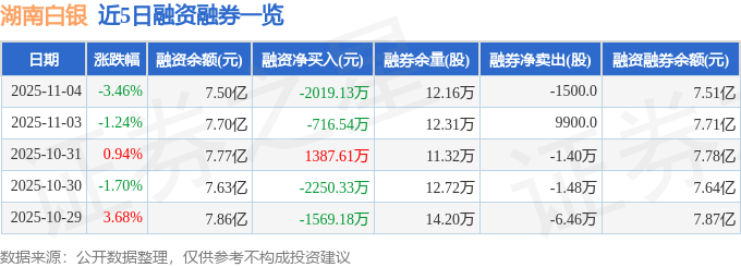 湖南白银融资融券信息显示,融资方面,当日融资买入4542.33万元,融资偿还6561.46万元,融资净偿还2019.13万元。融券方面,融券卖出2.16万股,融券偿还2.31万股,融券余量12.16万股,融券余额74.54万元。融资融券余额7.51亿元。