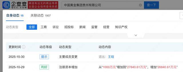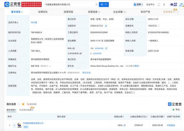 企查查APP显示,近日,中国黄金集团贵州有限公司发生工商变更,注册资本由1000万人民币增至约2.8亿人民币,增幅约2684%。企查查信息显示,该公司成立于2005年11月,法定代表人为肖光富,经营范围含水文地质、工程地质、环境地质调查等,由中国黄金集团有限公司全资持股。